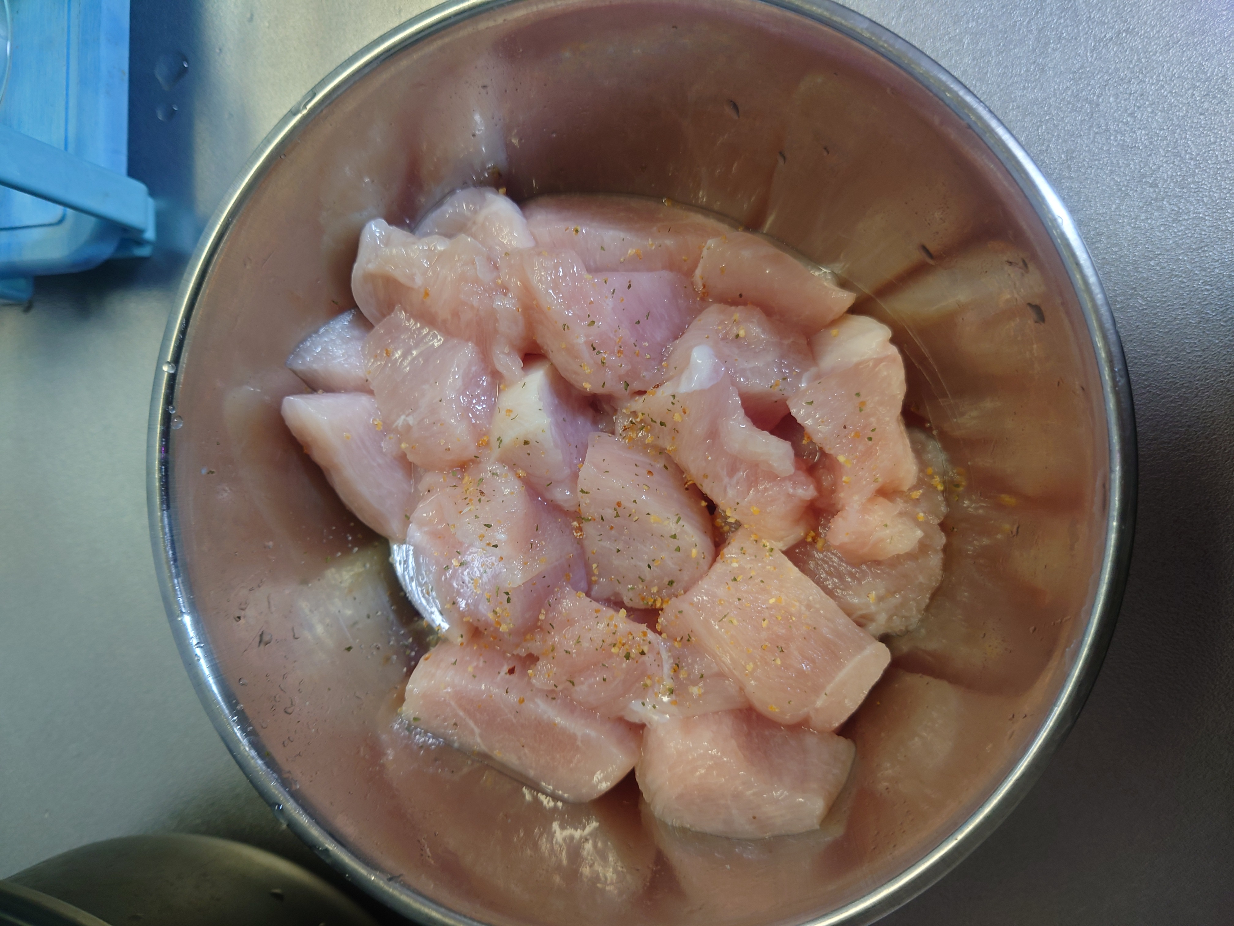 - 鶏むね肉を食べやすいサイズにカットし、マジックソルト(ソルトガーリック味)を揉み込む。
