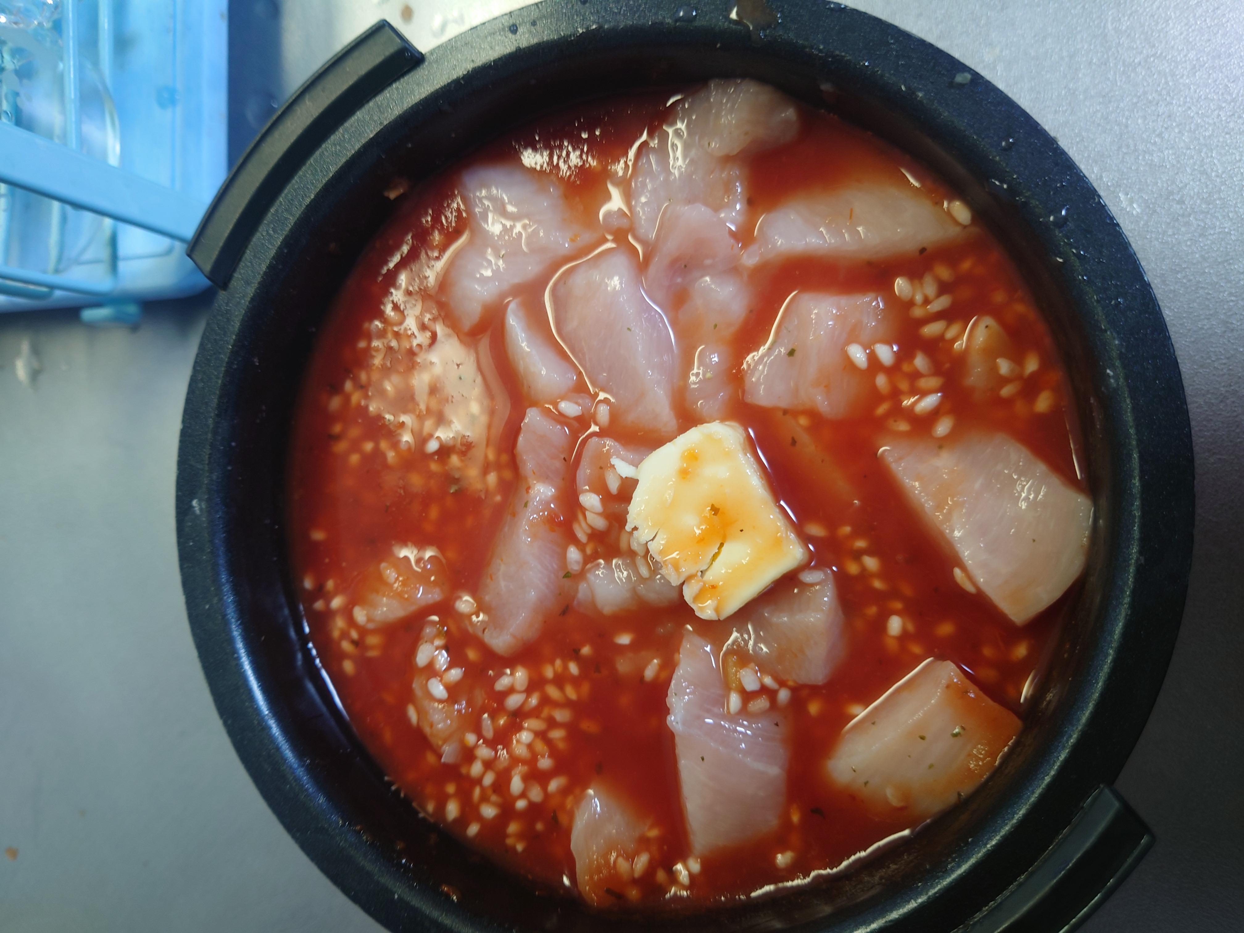 - 米・鶏肉・トマトソースをすべて炊飯器にぶち込み、「炊き込みご飯モード」で炊飯。