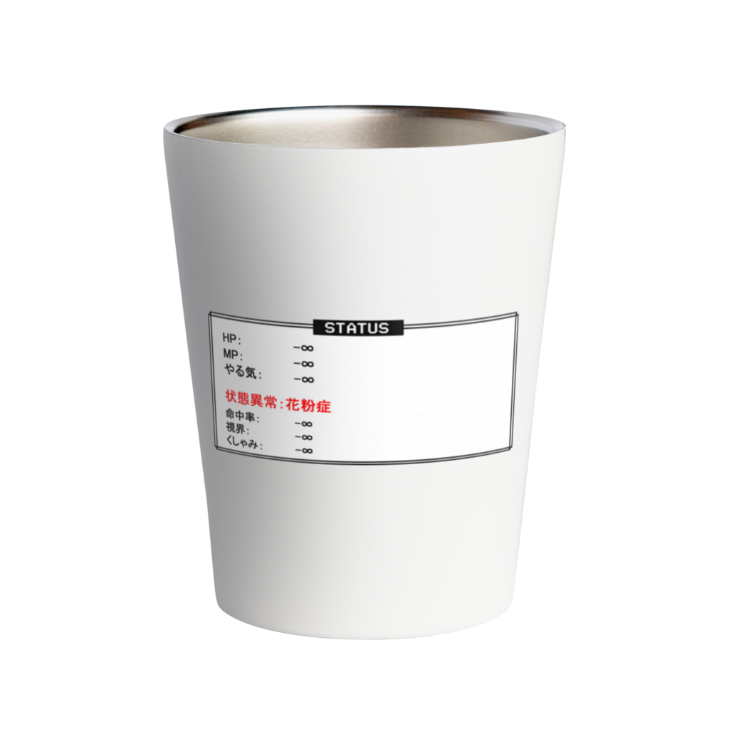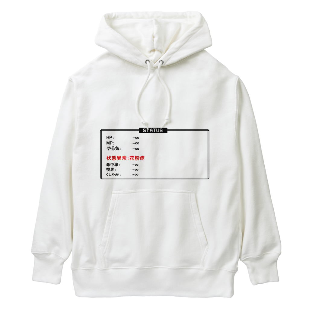 花粉症Tシャツ, 状態異常花粉症, ゲーム風デザイン, ステータス画面, 春のネタ服, 共感アパレル, 面白いTシャツ, ネタ極振り, RPG風アイテム, 花粉対策グッズ